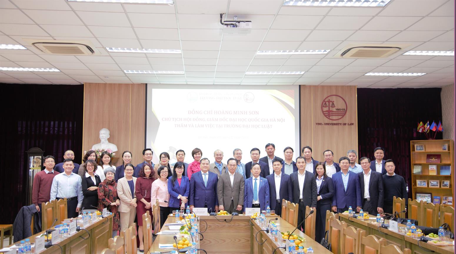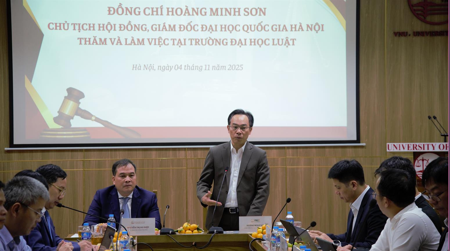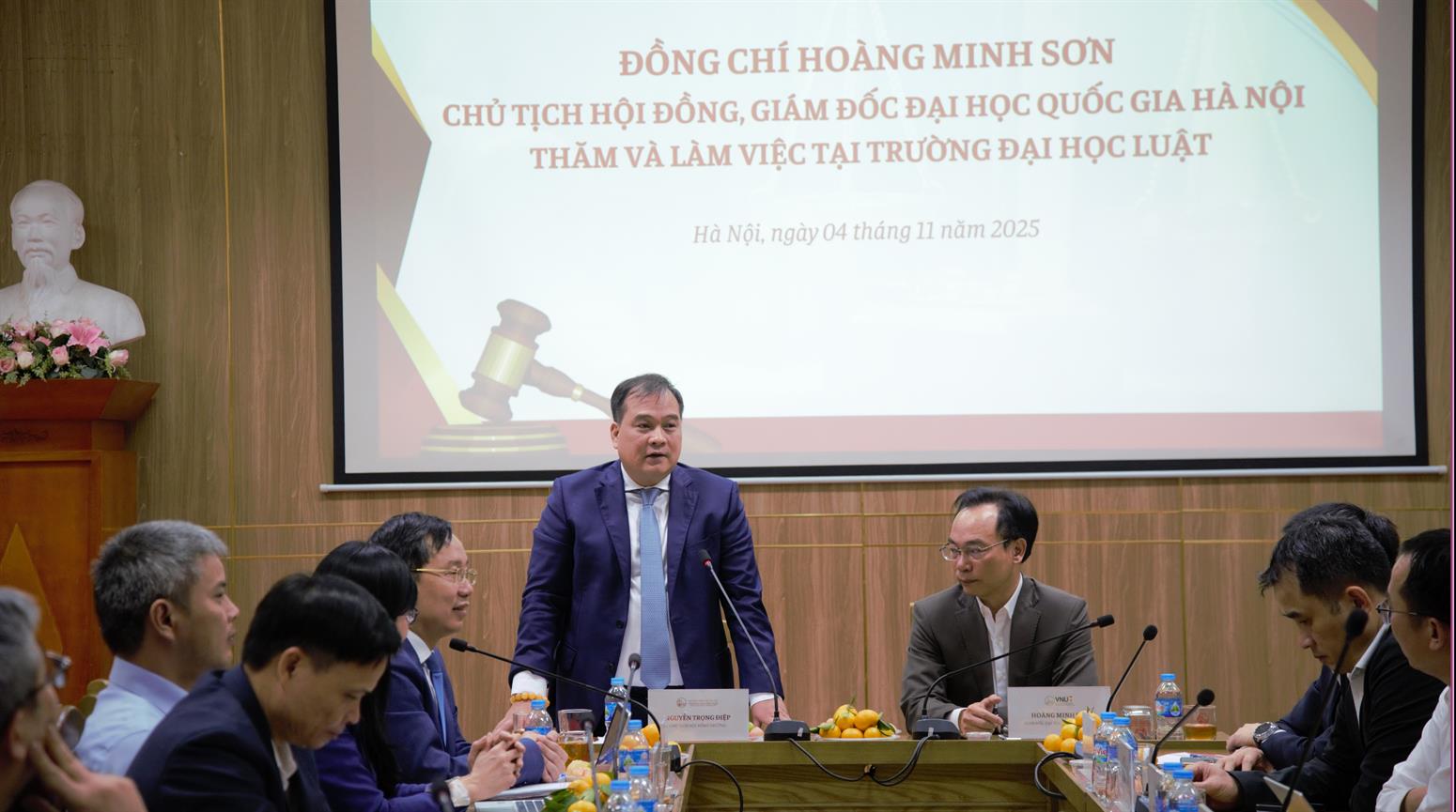 Chiều ngày 04/11/2025, Đ/c Hoàng Minh Sơn - Chủ tịch Hội đồng, Giám đốc ĐHQGHN cùng Đoàn công tác đã đến thăm và làm việc với Trường Đại học Luật. Tham gia Đoàn có Đồng chí Nguyễn Hiệu, Phó Bí thư Thường trực Đảng ủy, Phó Giám đốc thường trực ĐHQGHN, Đồng chí Phạm Bảo Sơn, Phó Giám đốc ĐHQGHN cùng lãnh đạo Văn phòng ĐHQGHN, Văn phòng Đảng ủy và lãnh đạo các ban chức năng. Về phía Trường Đại học Luật, tiếp đón Giám đốc ĐHQGHN và Đoàn Công tác là Đồng chí Nguyễn Trọng Điệp (Bí thư Đảng ủy, Chủ tịch Hội đồng Trường); Đồng chí Trịnh Tiến Việt (Quyền Hiệu trưởng); Đồng chí Nguyễn Hoàng Anh (Phó Hiệu trưởng) cùng đại diện lãnh đạo các khoa chuyên môn, phòng chức năng, trung tâm nghiên cứu và đại diện các tổ chức đoàn thể của Trường là cán bộ chủ chốt của Trường. Thay mặt Tập thể lãnh đạo Trường, PGS.TS. Nguyễn Trọng Điệp bày tỏ lời cảm ơn tới sự quan tâm, chỉ đạo sát sao của Ban Giám đốc và các ban chức năng ĐHQGHN đối với Trường trong thời gian qua. Đồng chí cũng báo cáo khái quát một số kết quả nổi bật của Nhà trường, trong đó lĩnh vực Luật của ĐHQGHN được xếp hạng trong nhóm 351-400 thế giới theo bảng xếp hạng QS năm 2025, Trường được công nhận đạt chuẩn cơ sở giáo dục đại học theo quy định của Bộ Giáo dục và Đào tạo cùng nhiều hoạt động khoa học, hợp tác quốc tế và phản biện chính sách đạt nhiều thành tựu rất đáng tự hào. Đồng thời, Bí thư Đảng ủy bày tỏ kỳ vọng Buổi làm việc với Giám đốc cùng các lãnh đạo chủ chốt của ĐHQGHN sẽ tiếp thêm nhiều động lực mới, mở ra những hướng phát triển mới trong bối cảnh Đảng, Nhà nước đang dành nhiều sự quan tâm đặc biệt cho sự phát triển đột phá của giáo dục và đào tạo nói chung và ĐHQGHN nói riêng. Phát biểu chỉ đạo buổi làm việc, Giám đốc ĐHQGHN đánh giá cao những kết quả đạt được cũng như vai trò, vị thế, những đóng góp của Trường Đại học Luật trong hệ thống ĐHQGHN nói riêng và trong công tác đào tạo, nghiên cứu và phát triển nguồn nhân lực pháp luật chất lượng cao của đất nước nói chung trong suốt nửa thế kỷ hình thành và phát triển. Giám đốc nhấn mạnh, mặc dù là một trường đại học thành viên ‘trẻ’ nhất trong hệ thống ĐHQGHN, song Trường Đại học Luật lại có bề dày truyền thống lâu đời, kế thừa di sản của hơn nửa thế kỷ hình thành và phát triển của Khoa Pháp lý Trường Đại học Tổng hợp Hà Nội - cơ sở đào tạo luật đầu tiên tại Việt Nam. Với lĩnh vực đào tạo luật, một lĩnh vực đặc biệt quan trọng, gắn liền với sự phát triển của Nhà nước pháp quyền và tiến trình hội nhập quốc tế của Việt Nam, Trường giữ vai trò trọng yếu trong việc cung cấp nguồn nhân lực chất lượng cao phục vụ sự nghiệp xây dựng và phát triển đất nước. Giám đốc khẳng định, trong bối cảnh Đảng và Nhà nước đang ban hành nhiều chủ trương, chính sách đột phá như các nghị quyết về lĩnh vực giáo dục và đào tạo, về đổi mới công tác xây dựng, thi hành pháp luật, về phát triển đột phá về KHCN, ĐMST và CĐS sẽ đem lại cơ hội lớn, khẳng định vị thế, tầm quan trọng của pháp luật trong đời sống xã hội, nhưng cũng sẽ tạo ra các thách thức lớn cần phải vượt qua. Buổi làm việc hôm nay vì vậy mà có ý nghĩa hết sức quan trọng. Thay mặt Tập thể lãnh đạo Trường, Quyền Hiệu trưởng PGS.TS. Trịnh Tiến Việt đã trình bày báo cáo tổng hợp kết quả nổi bật của năm học 2024-2025 và phương hướng, nhiệm vụ trọng tâm năm học 2025-2026, tập trung vào các nội dung như triển khai nghị quyết của Đảng về phát triển đội ngũ, thúc đẩy chuyển đổi số trong quản trị đại học, hoàn thiện chuẩn chương trình đào tạo lĩnh vực pháp luật, mở rộng hợp tác quốc tế, định hướng phát triển Trường trên Đô thị Đại học Hòa Lạc và chuẩn bị tổ chức Lễ kỷ niệm 50 năm hình thành và phát triển Trường (1976-2026). Buổi làm việc diễn ra trong không khí trao đổi cởi mở, thẳng thắn và mang tính xây dựng cao. Đại diện Ban Giám đốc và các ban chức năng của ĐHQGHN cùng lãnh đạo, giảng viên Trường Đại học Luật đã cùng thảo luận sâu trên nhiều nội dung trọng tâm, từ định hướng phát triển khoa học - công nghệ, hoạt động đào tạo và kiểm định chất lượng, đến công tác tổ chức cán bộ, cơ sở vật chất và hợp tác phát triển trong nước, quốc tế. Các ý kiến từ ĐHQGHN đều thể hiện sự quan tâm, đồng hành và sẵn sàng hỗ trợ Trường trong quá trình hoàn thiện mô hình tổ chức, đổi mới quản trị, nâng cao năng lực nghiên cứu, chất lượng đào tạo và thúc đẩy chuyển đổi số trong quản trị đại học. Về phía Trường Đại học Luật, lãnh đạo Trường cũng chủ động đề xuất nhiều giải pháp nhằm phát huy thế mạnh học thuật, tăng cường hiệu quả phối hợp với các 