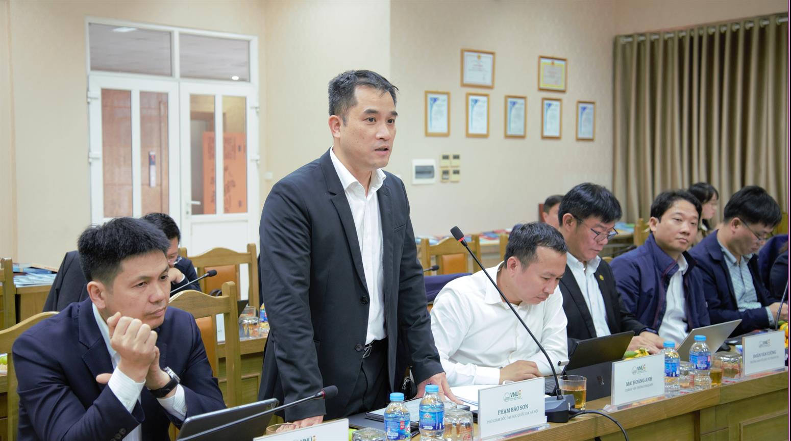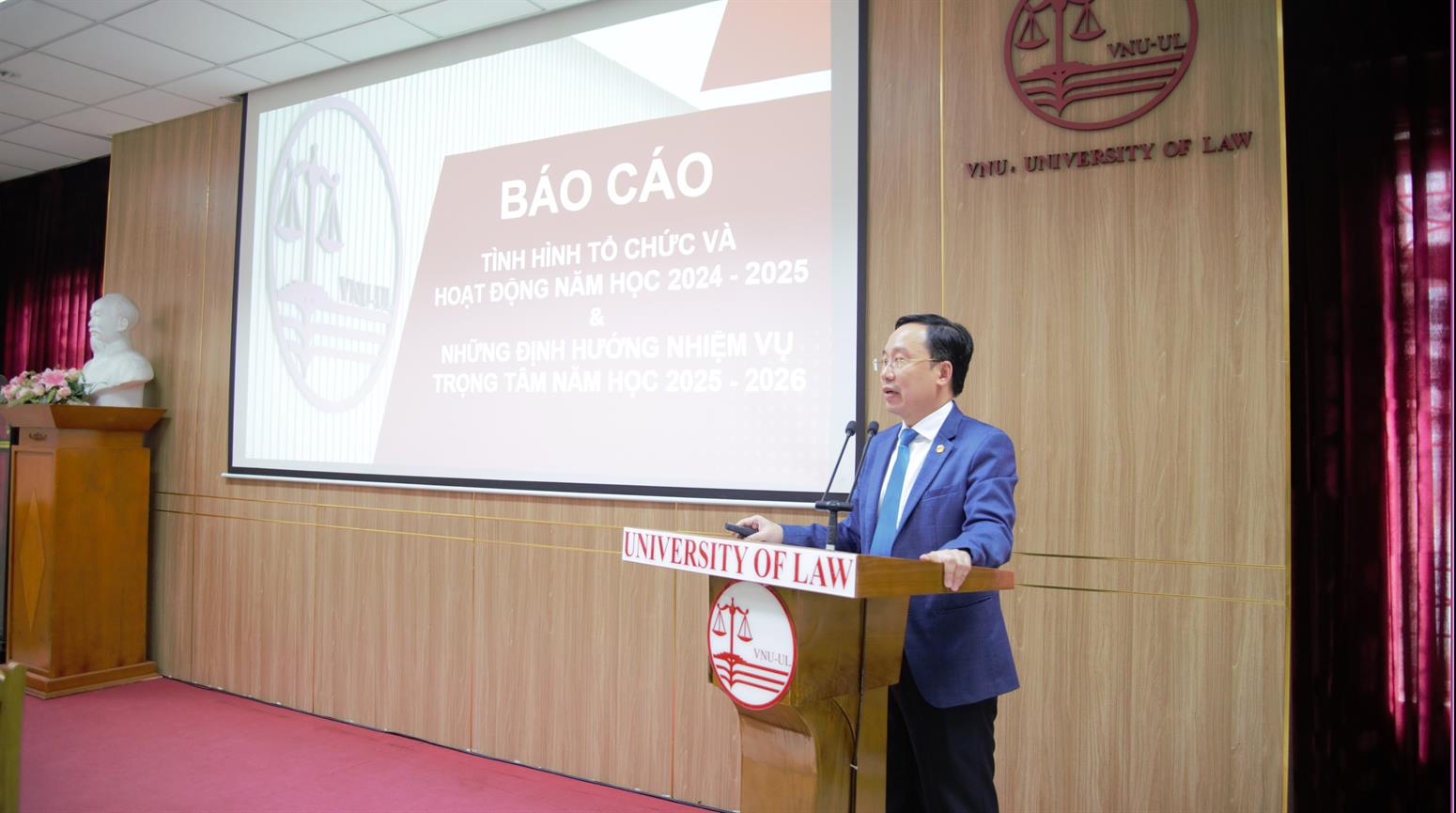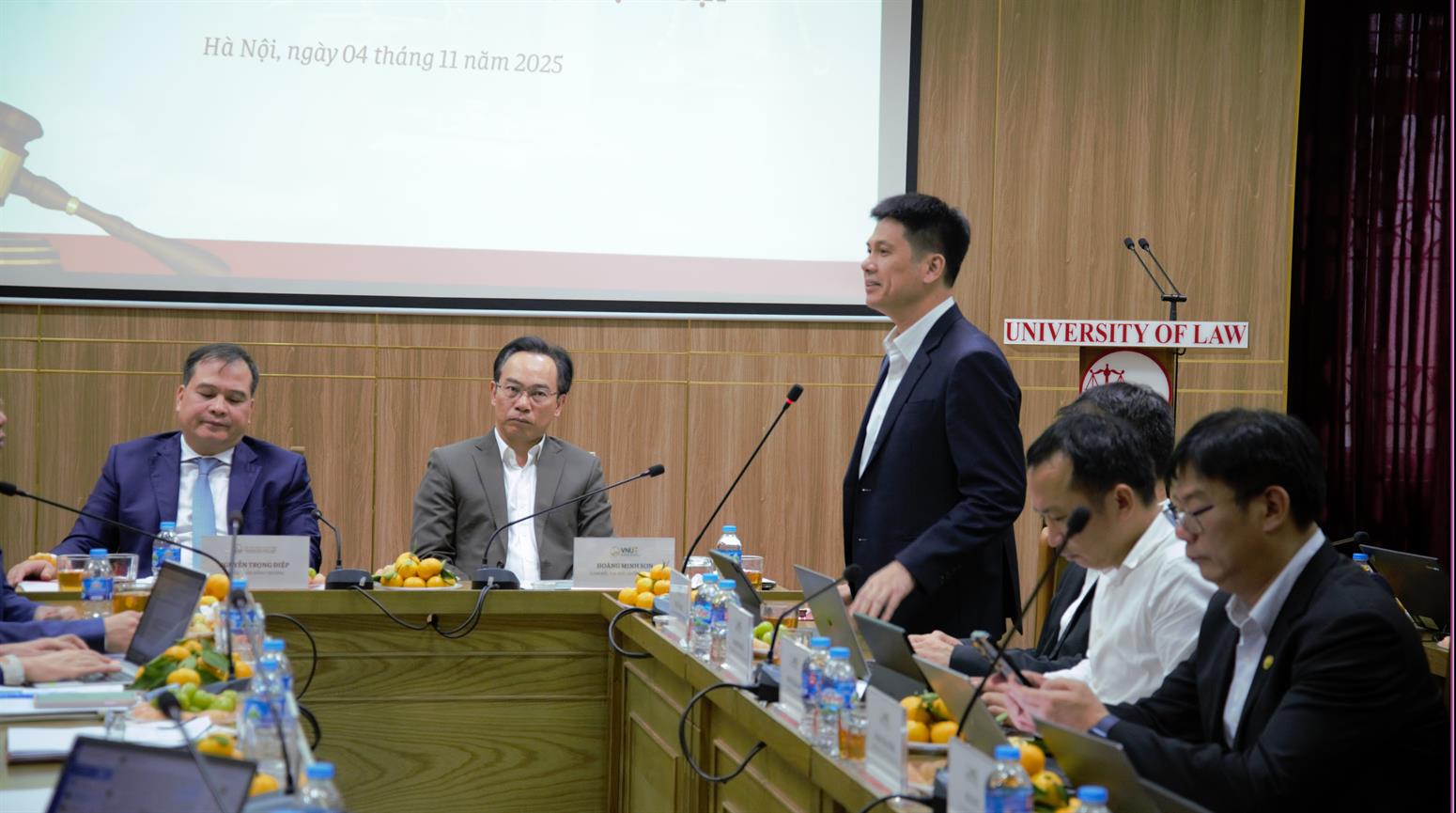 Chiều ngày 04/11/2025, Đ/c Hoàng Minh Sơn - Chủ tịch Hội đồng, Giám đốc ĐHQGHN cùng Đoàn công tác đã đến thăm và làm việc với Trường Đại học Luật. Tham gia Đoàn có Đồng chí Nguyễn Hiệu, Phó Bí thư Thường trực Đảng ủy, Phó Giám đốc thường trực ĐHQGHN, Đồng chí Phạm Bảo Sơn, Phó Giám đốc ĐHQGHN cùng lãnh đạo Văn phòng ĐHQGHN, Văn phòng Đảng ủy và lãnh đạo các ban chức năng. Về phía Trường Đại học Luật, tiếp đón Giám đốc ĐHQGHN và Đoàn Công tác là Đồng chí Nguyễn Trọng Điệp (Bí thư Đảng ủy, Chủ tịch Hội đồng Trường); Đồng chí Trịnh Tiến Việt (Quyền Hiệu trưởng); Đồng chí Nguyễn Hoàng Anh (Phó Hiệu trưởng) cùng đại diện lãnh đạo các khoa chuyên môn, phòng chức năng, trung tâm nghiên cứu và đại diện các tổ chức đoàn thể của Trường là cán bộ chủ chốt của Trường. Thay mặt Tập thể lãnh đạo Trường, PGS.TS. Nguyễn Trọng Điệp bày tỏ lời cảm ơn tới sự quan tâm, chỉ đạo sát sao của Ban Giám đốc và các ban chức năng ĐHQGHN đối với Trường trong thời gian qua. Đồng chí cũng báo cáo khái quát một số kết quả nổi bật của Nhà trường, trong đó lĩnh vực Luật của ĐHQGHN được xếp hạng trong nhóm 351-400 thế giới theo bảng xếp hạng QS năm 2025, Trường được công nhận đạt chuẩn cơ sở giáo dục đại học theo quy định của Bộ Giáo dục và Đào tạo cùng nhiều hoạt động khoa học, hợp tác quốc tế và phản biện chính sách đạt nhiều thành tựu rất đáng tự hào. Đồng thời, Bí thư Đảng ủy bày tỏ kỳ vọng Buổi làm việc với Giám đốc cùng các lãnh đạo chủ chốt của ĐHQGHN sẽ tiếp thêm nhiều động lực mới, mở ra những hướng phát triển mới trong bối cảnh Đảng, Nhà nước đang dành nhiều sự quan tâm đặc biệt cho sự phát triển đột phá của giáo dục và đào tạo nói chung và ĐHQGHN nói riêng. Phát biểu chỉ đạo buổi làm việc, Giám đốc ĐHQGHN đánh giá cao những kết quả đạt được cũng như vai trò, vị thế, những đóng góp của Trường Đại học Luật trong hệ thống ĐHQGHN nói riêng và trong công tác đào tạo, nghiên cứu và phát triển nguồn nhân lực pháp luật chất lượng cao của đất nước nói chung trong suốt nửa thế kỷ hình thành và phát triển. Giám đốc nhấn mạnh, mặc dù là một trường đại học thành viên ‘trẻ’ nhất trong hệ thống ĐHQGHN, song Trường Đại học Luật lại có bề dày truyền thống lâu đời, kế thừa di sản của hơn nửa thế kỷ hình thành và phát triển của Khoa Pháp lý Trường Đại học Tổng hợp Hà Nội - cơ sở đào tạo luật đầu tiên tại Việt Nam. Với lĩnh vực đào tạo luật, một lĩnh vực đặc biệt quan trọng, gắn liền với sự phát triển của Nhà nước pháp quyền và tiến trình hội nhập quốc tế của Việt Nam, Trường giữ vai trò trọng yếu trong việc cung cấp nguồn nhân lực chất lượng cao phục vụ sự nghiệp xây dựng và phát triển đất nước. Giám đốc khẳng định, trong bối cảnh Đảng và Nhà nước đang ban hành nhiều chủ trương, chính sách đột phá như các nghị quyết về lĩnh vực giáo dục và đào tạo, về đổi mới công tác xây dựng, thi hành pháp luật, về phát triển đột phá về KHCN, ĐMST và CĐS sẽ đem lại cơ hội lớn, khẳng định vị thế, tầm quan trọng của pháp luật trong đời sống xã hội, nhưng cũng sẽ tạo ra các thách thức lớn cần phải vượt qua. Buổi làm việc hôm nay vì vậy mà có ý nghĩa hết sức quan trọng. Thay mặt Tập thể lãnh đạo Trường, Quyền Hiệu trưởng PGS.TS. Trịnh Tiến Việt đã trình bày báo cáo tổng hợp kết quả nổi bật của năm học 2024-2025 và phương hướng, nhiệm vụ trọng tâm năm học 2025-2026, tập trung vào các nội dung như triển khai nghị quyết của Đảng về phát triển đội ngũ, thúc đẩy chuyển đổi số trong quản trị đại học, hoàn thiện chuẩn chương trình đào tạo lĩnh vực pháp luật, mở rộng hợp tác quốc tế, định hướng phát triển Trường trên Đô thị Đại học Hòa Lạc và chuẩn bị tổ chức Lễ kỷ niệm 50 năm hình thành và phát triển Trường (1976-2026). Buổi làm việc diễn ra trong không khí trao đổi cởi mở, thẳng thắn và mang tính xây dựng cao. Đại diện Ban Giám đốc và các ban chức năng của ĐHQGHN cùng lãnh đạo, giảng viên Trường Đại học Luật đã cùng thảo luận sâu trên nhiều nội dung trọng tâm, từ định hướng phát triển khoa học - công nghệ, hoạt động đào tạo và kiểm định chất lượng, đến công tác tổ chức cán bộ, cơ sở vật chất và hợp tác phát triển trong nước, quốc tế. Các ý kiến từ ĐHQGHN đều thể hiện sự quan tâm, đồng hành và sẵn sàng hỗ trợ Trường trong quá trình hoàn thiện mô hình tổ chức, đổi mới quản trị, nâng cao năng lực nghiên cứu, chất lượng đào tạo và thúc đẩy chuyển đổi số trong quản trị đại học. Về phía Trường Đại học Luật, lãnh đạo Trường cũng chủ động đề xuất nhiều giải pháp nhằm phát huy thế mạnh học thuật, tăng cường hiệu quả phối hợp với các 
